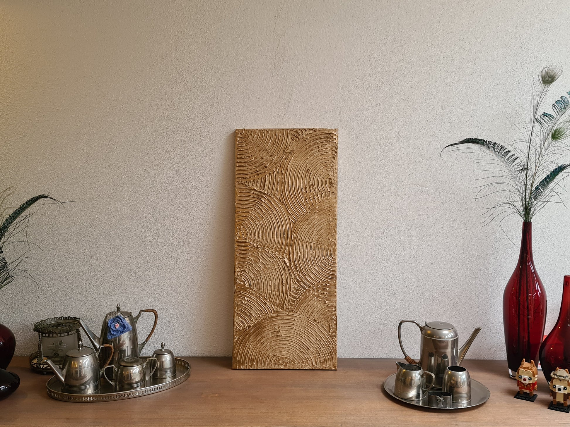 Een canvasdoek, boetseerpasta en gouden decoratie spray.
